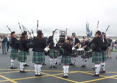 | Sunday 19th August and Islay Airport Open Day. Unlike the previous day at Kilchoman Gala Day, the weather was grey and damp. This year's visiting aircraft were a 'crop-spraying' biplane that undertook some rather stomach churning flips, a world war one biplane that looked as if it was constructed from balsa wood and tissue paper (and possibly was), a hawk jet trainer which made flying fast and looping look very easy, a British Airways Saab, which has occasionally substituted on the Glasgow-Islay run, and Bruno Schroder's Pilatus which gave flights round Islay and up to Colonsay to holders of lucky programmes. Entertainment was provided by Islay Pipe Band, there were demonstrations by the emergency services and the whole affair was opened by Lord George Robertson of Port Ellen and expert commentary by the redoubtable Jim Davis. Enjoy the pictures. | |